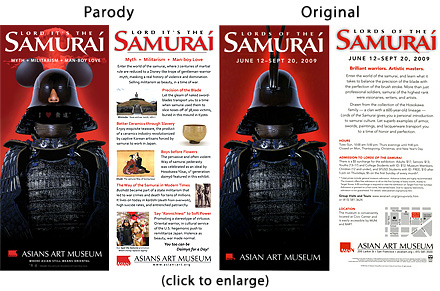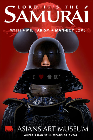 Five years after the blockbuster Geisha: Beyond the Painted Smile exhibition, the Asian Art Museum turned to her male trope counterpart with the Darth Vader-esque "Lords of the Samurai" exhibit, complete with romantically exoticist marketing campaign. Their promotion reads: