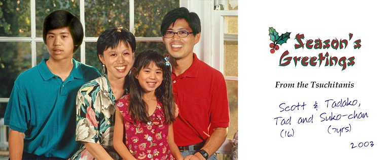 I sent this card to friends and relatives during the holiday season of 2003. Single childless art student of little means living in a rented studio apartment in the Castro, I photoshopped pictures of my face, taken at ages roughly appropriate to the figures, onto an image found in an internet search for “ideal Asian American family.”